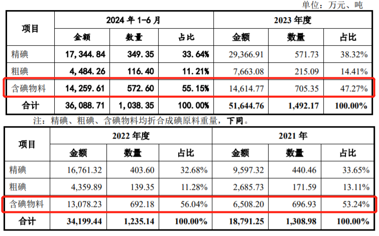 招股书显示,博苑股份重要的原材料是含碘物料。报告期内,公司来自含碘物料采购量占整体碘原料采购量的比例分别为53.24%、56.04%、47.27%和55.15%。