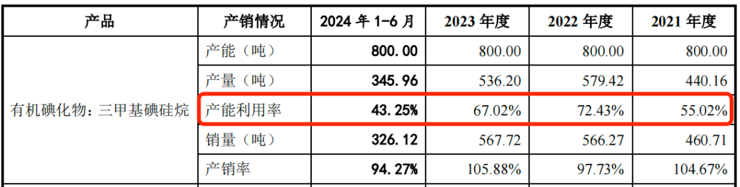 此外,博苑股份目前主要的有机碘化物是三甲基碘硅烷,报告期内产能利用率分别为55.02%、72.43%、67.02%和43.25%,自2022年开始该产品的产能利用率便逐年下降。