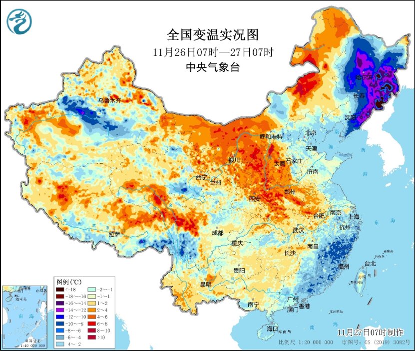 据中央气象台11月27日消息,今晨,降温主要在东北地区和江南东部一带,山东半岛、上海、浙江东部和南部、福建、广东东部等地出现4~8℃降温,黑龙江中部、吉林中东部、辽宁东部等地降幅达10~20℃。气温0℃线位于陕西南部至山西南部、山东中部一带。