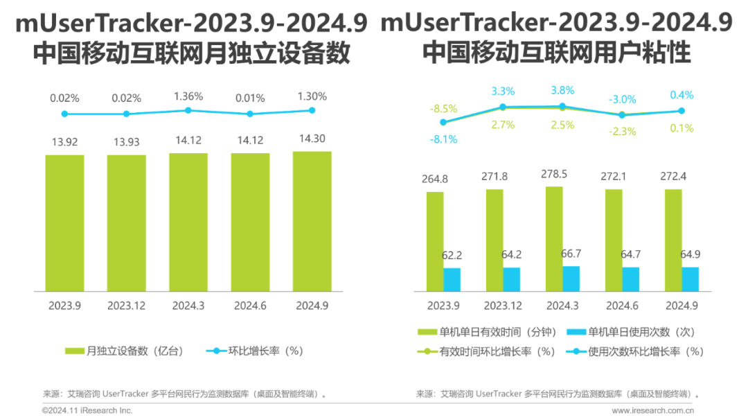 移动互联网流量小幅增长,用户粘性整体趋于稳定:2024Q3中国移动互联网月独立设备数增至14.3亿,环比Q2增长1.3%;用户单日使用次数为64.9次、时长为272.4分钟,与上一季度基本持平。