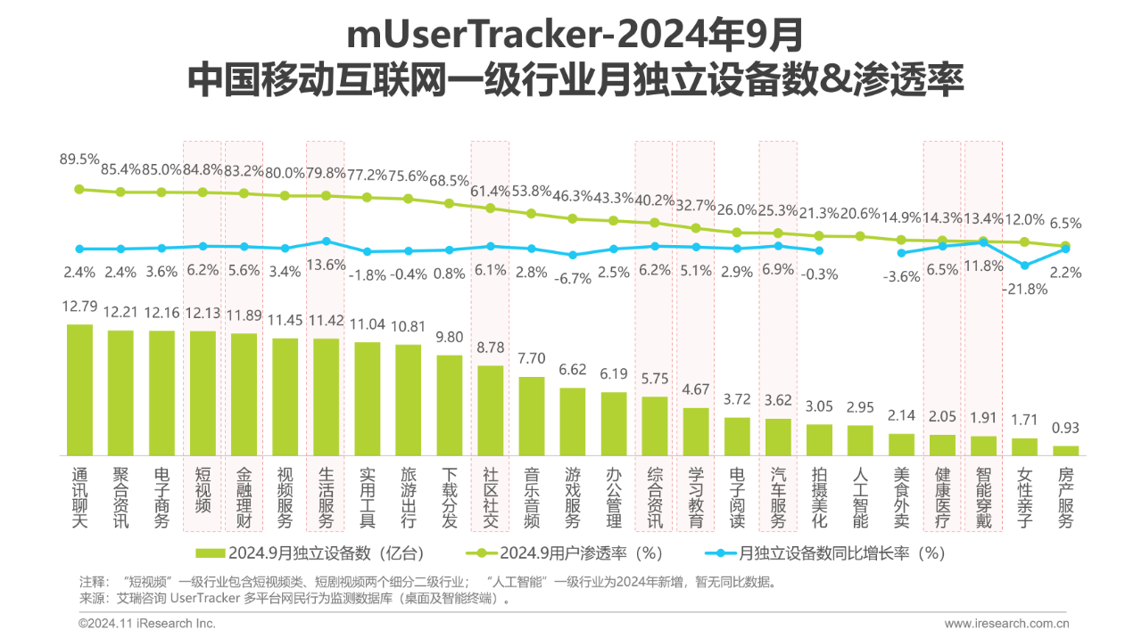 在TOP25一级行业中,19个行业实现流量同比正增长。其中,通讯聊天以12.79亿的月独立设备数、 89.5%的用户渗透率领跑市场;短视频、金融理财等行业同样展现出强大的用户吸引力,渗透率均超过80%;女性亲子、房产服务等行业的用户渗透率相对较低,且增速有限,甚至出现负增长;而人工智能作为新兴的一级行业正加速渗透,其影响力和市场潜力不容小觑。