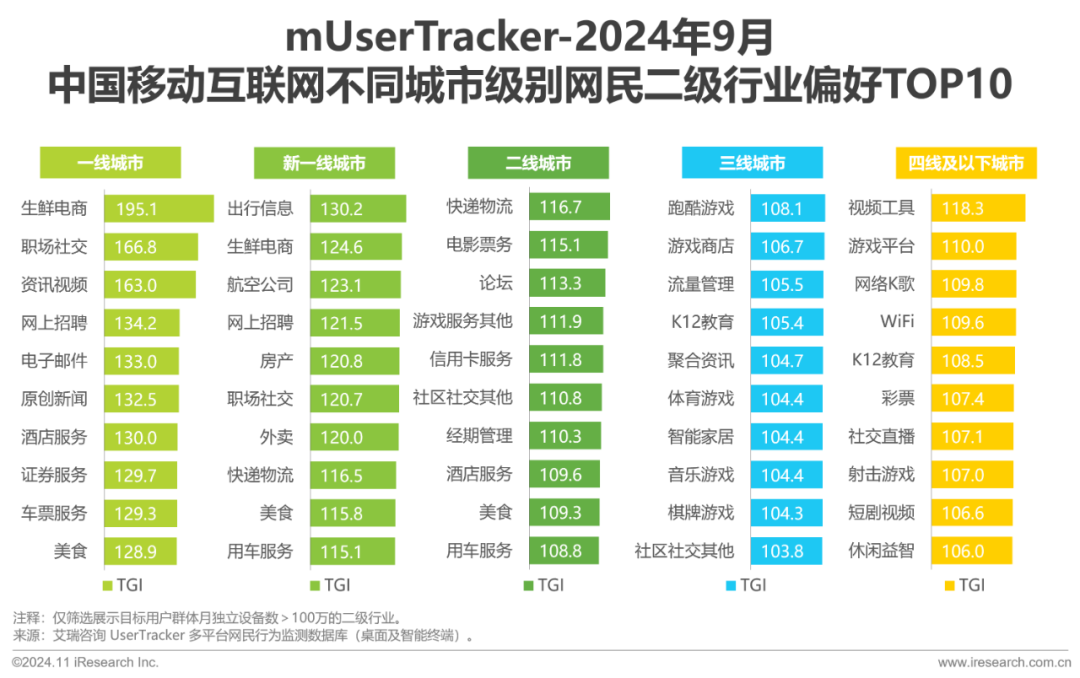 高线城市用户偏好生活服务与个人发展,低线城市用户更爱游戏娱乐