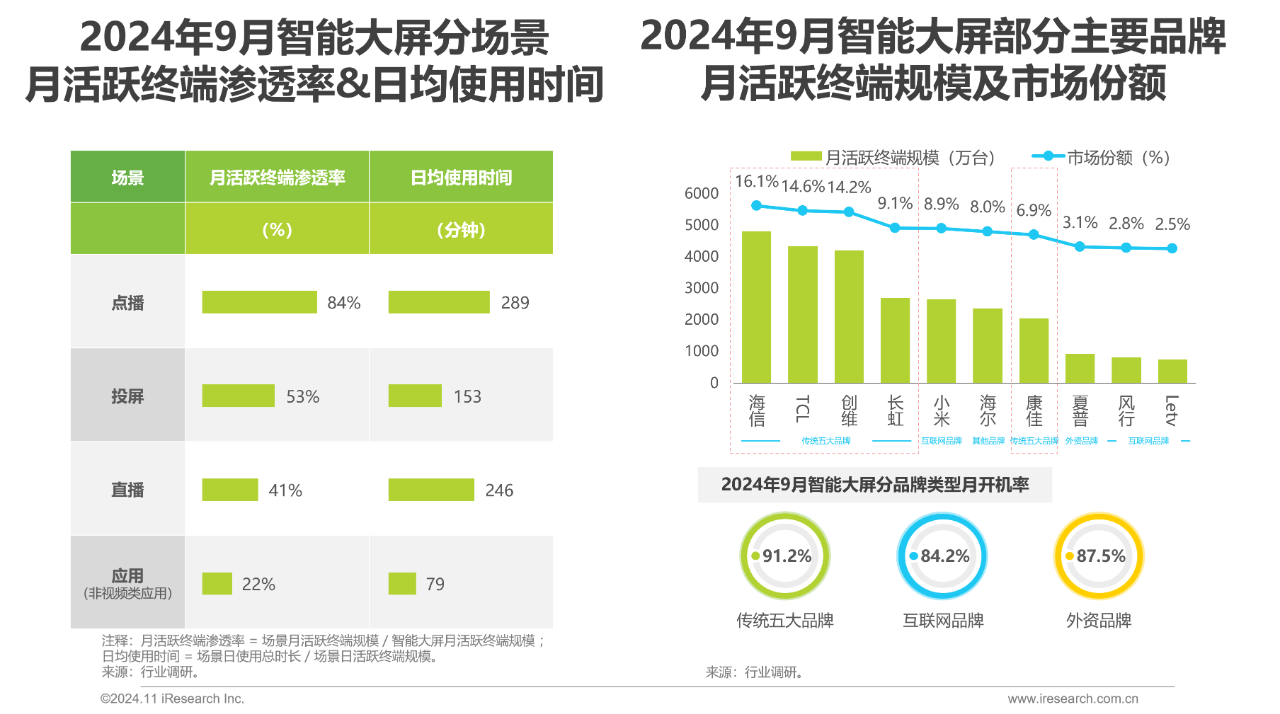 点播、直播日均使用时间突出,投屏终端渗透率超50%;传统五大品牌终端活跃度领先,市场份额超60%