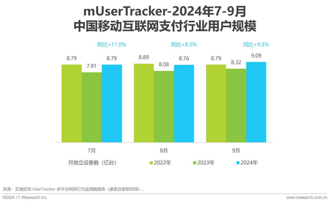 移动互联网支付行业流量同比增速稳定在较高水平,7-9月增长率分别为11.0%、8.5%、9.3%,9月行业活跃用户规模达9.09亿,表明随着移动支付技术的不断成熟,其便利性促使越来越多的用户选择线上支付方式,且支付场景持续拓展,深入渗透至生活各领域,推动行业用户规模持续扩大,增长势能强劲。