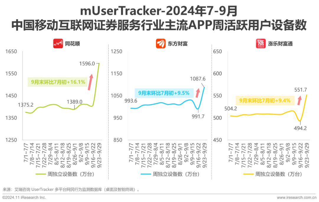 Q3末期系列政策的出台,为证券市场营造了良好的投资氛围,极大激发了投资者热情,头部APP流量剧增,其中同花顺APP流量9月末环比7月初增长16.1%、东方财富增长9.5%、涨乐财富通增长9.4%。政策助力下,头部APP凭借服务、功能及品牌影响力优势吸引大量用户下载使用,巩固了其市场领先地位,引领行业流量增长,并推动行业竞争格局不断优化。