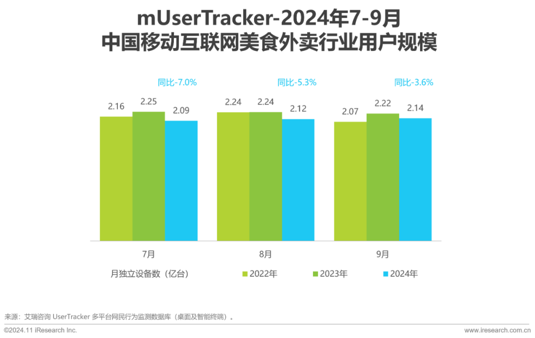 7-9月,移动互联网美食外卖行业月独立设备数在2亿左右波动,对比去年同期分别下降7.0%、5.3%和3.6%,行业活跃用户规模面临缩减压力,这可能指向市场饱和、消费者行为转变或宏观经济因素对行业的影响,相关企业需要探索新的增长点以应对当前挑战。