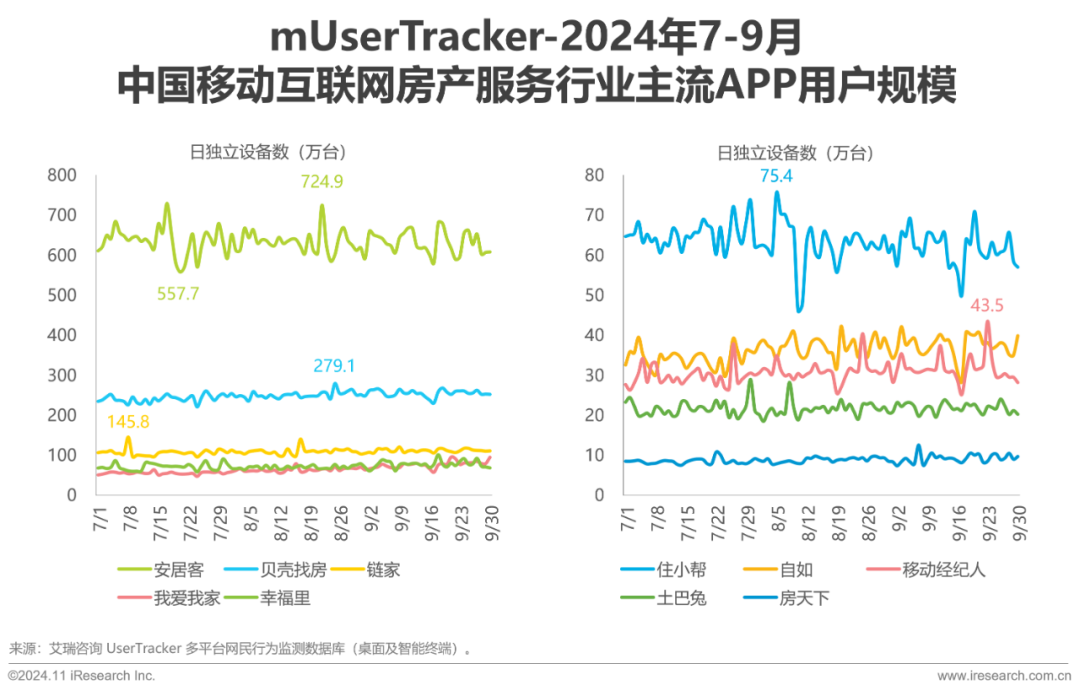 2024年7-9月,中国移动互联网房产服务行业用户规模对比去年同期实现正增长,表明市场对政策调整的反应积极,行业信心逐步恢复。在国家和地方政策的共同作用下,尤其是房地产市场调控政策的优化,用户行动意愿有所提升,行业流量和用户活跃度得到一定程度上的改善。