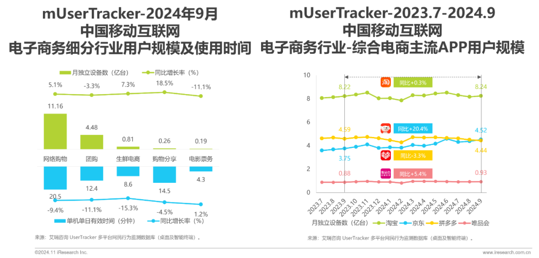 2024年9月,电子商务细分行业用户规模和使用时间分化,网络购物主导流量和用户注意力,而电影票务流量同比则下降超一成。综合电商中,京东第三季度流量稳步上升、淘宝波动、拼多多和唯品会相对稳定;各平台通过策略调整争夺市场,竞争加剧,行业格局动态调整。