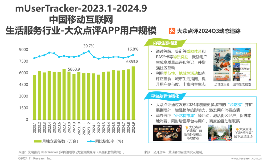 生活服务行业用户基数大幅扩张:生活服务行业月独立设备数突破11亿,用户活跃度持续提升,其中,大众点评凭借内容生态与品牌战略的协同发展,推动APP活跃用户规模扩大及品牌影响力的广泛辐射。