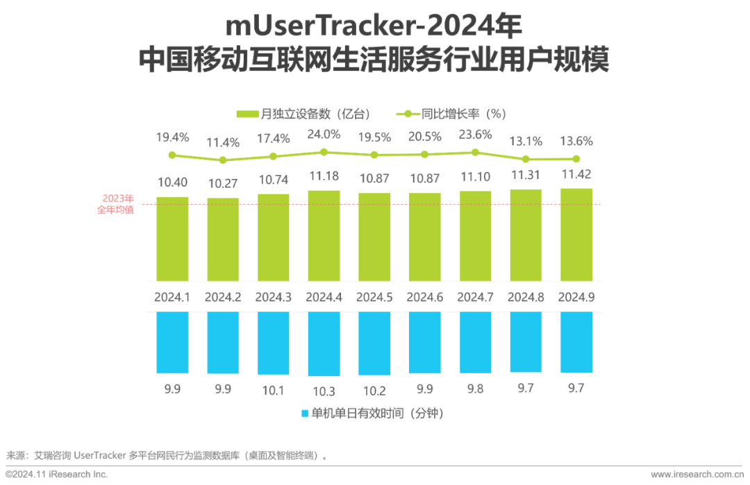 2024年,生活服务行业流量同比增长率在各月均保持在10%以上的较高水平,Q3月独立设备数逐月攀升,9月活跃用户规模达11.42亿;同时,单机单日有效使用时间稳定在10分钟左右,用户活跃度较高。行业在移动互联网领域的用户基础稳固扩大,市场渗透率同步提升。