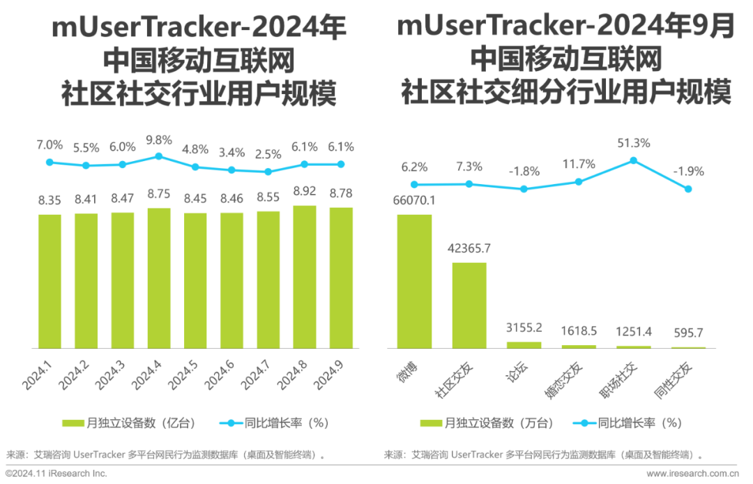 2024年,中国移动互联网社区社交行业整体用户规模呈现稳健增长,月独立设备数Q3均值为8.75亿台、同比增速均值达4.9%,反映出行业平台在用户中的广泛吸引力。尽管整体趋势向好,各细分领域的发展速度和市场表现却呈现出差异性,这可能指向用户需求的多样化和平台服务的个性化趋势,要求各平台在内容创新和用户体验上进行更精准的市场定位和策略调整。