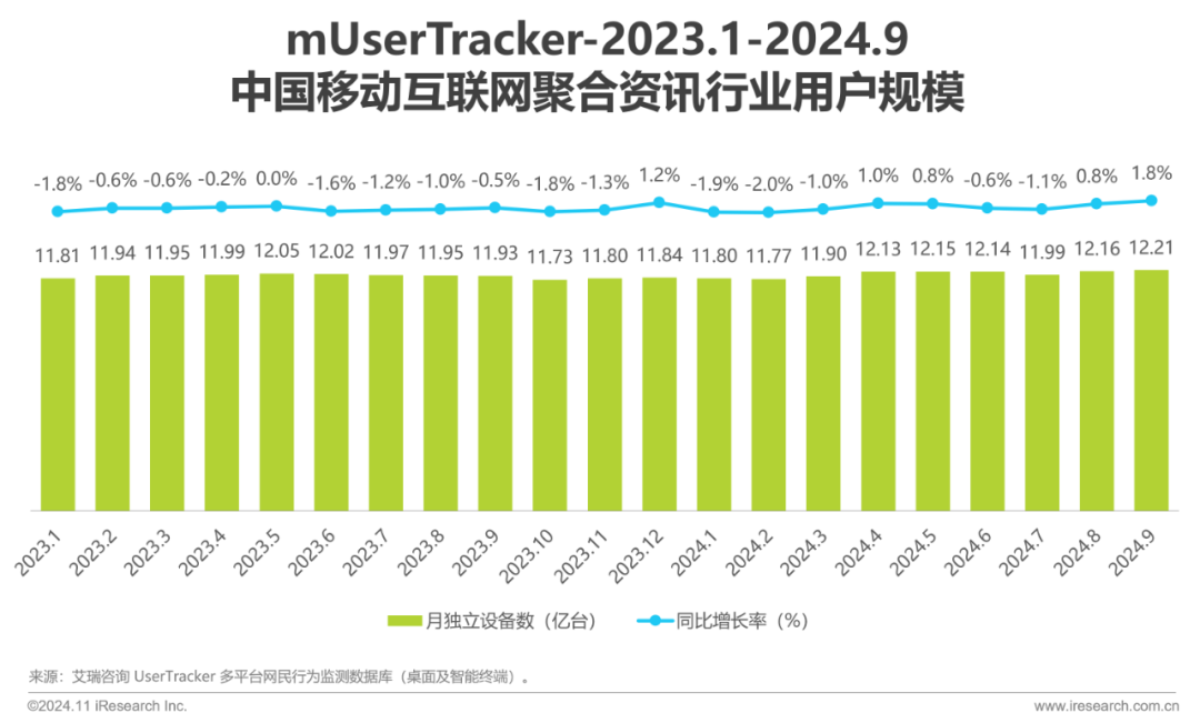 2024年9月,聚合资讯行业月独立设备数攀至2023年至今的最高点,活跃用户规模突破12.2亿,同比增长1.8%。用户对即时、综合资讯的需求推动了平台流量的增长,聚合资讯成为用户获取新闻与信息的关键来源。