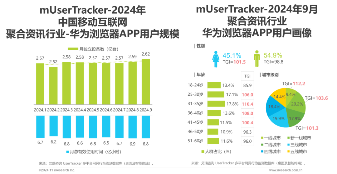 7-9月,华为浏览器APP在聚合资讯领域保持了流量和用户粘性的稳定表现,其用户在性别、年龄上分布相对均衡,中青年及中高线城市用户群体的TGI较高,反映出对APP的明显偏好和依赖,凸显了华为浏览器用户的市场价值和商业潜力,为平台上品牌营销和内容分发提供了优质的用户基础。