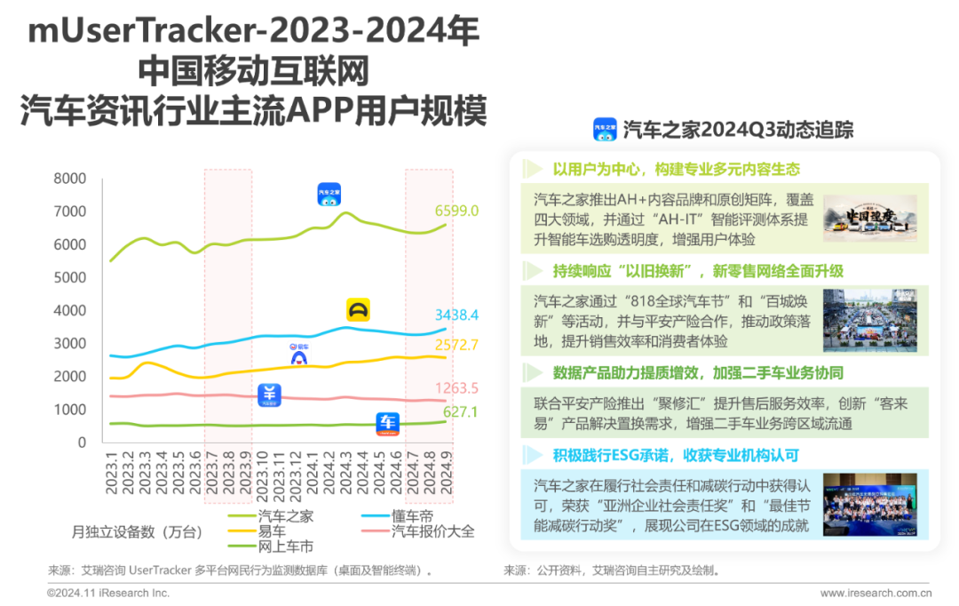 截至2024年9月,汽车之家APP活跃用户规模达6599.0万,同比+7.6%,行业影响力稳步提升。Q3汽车之家持续以用户为核心,打造内容生态,AH+品牌矩阵丰富多元,评测体系与图库优化体验,多平台联动共促流量增长;同时,汽车之家新零售借活动升级,“卫星计划”渗透下沉市场,数字化创新产品增效,二手车业务协同加强;此外,汽车之家积极践行ESG,展现出企业的社会担当。