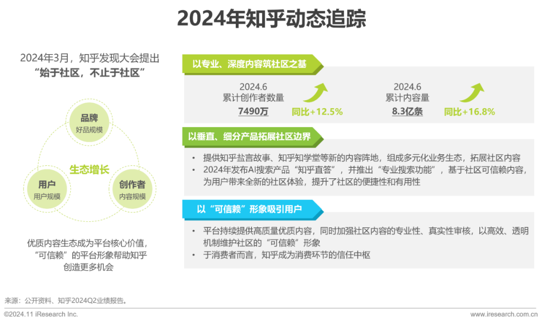 知乎作为典型的社区平台,通过提供高质量的内容和专业的社区氛围,成功建立了用户信任和活跃的互动环境。2024年,知乎的商业模式不断演进,从内容社区向“不止于社区”的多元生态拓展,通过推出盐言故事、知学堂等内容产品,以及引入AI功能,知乎不断拓宽其商业化渠道和市场影响力,体现了其在内容生态构建和商业模式创新方面的前瞻性和领导力。