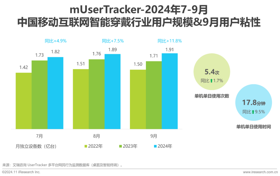 2024年7-9月,智能穿戴行业月独立设备数同比增长率逐月递增,至9月达到11.8%,显示出强劲增长势头;同时,用户对智能穿戴应用的使用频率和时长继续增加,用户活跃度得到同步提升,反映出行业在用户日常生活中的重要性日益增强。
