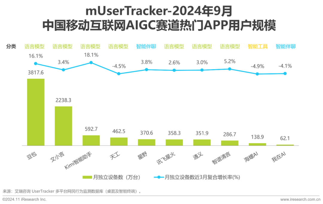 2024年,AIGC赛道月独立设备数实现翻番,从年初的3251.2万台增至9月的8281.1万台,渗透率从2.3%提升至5.8%。AIGC在移动互联网中正快速普及,市场接受度显著提升,市场影响力不断扩大。