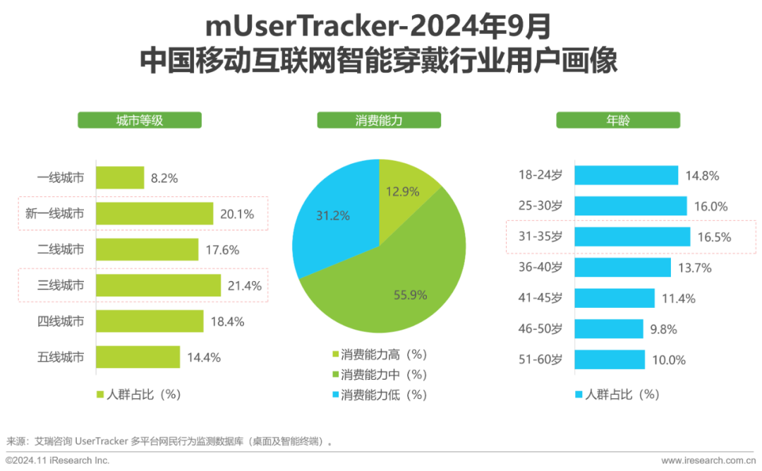 智能穿戴用户以城市中青年为主,中高消费能力用户占比高