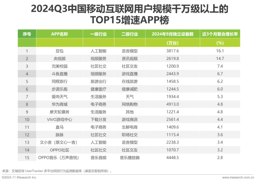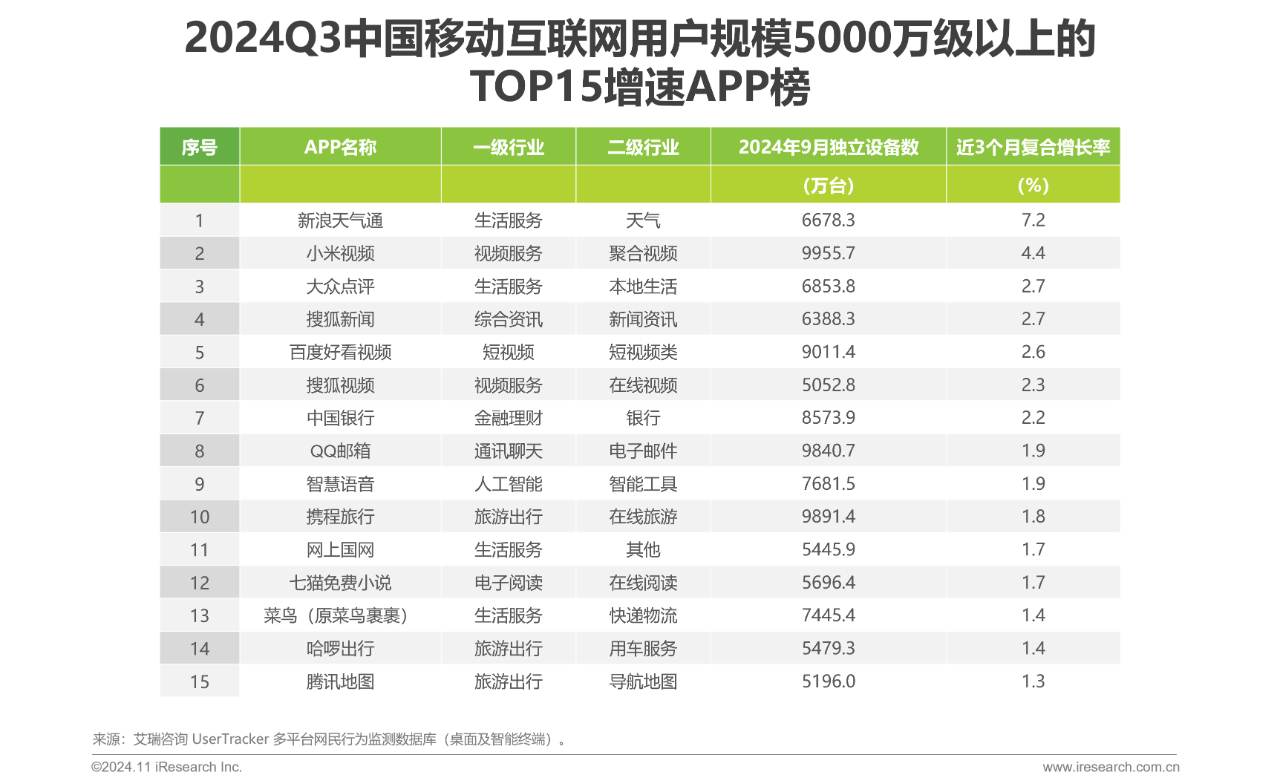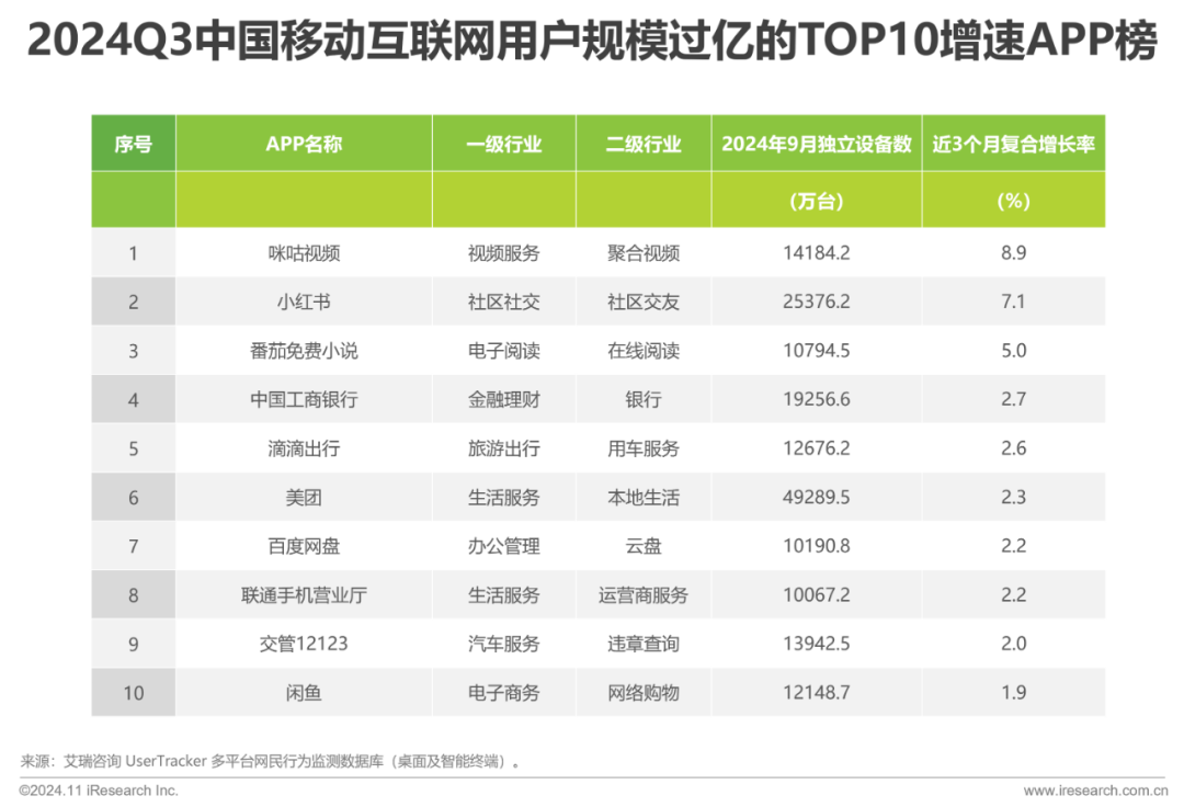 2024年9月MAU(月活跃设备数)亿级以上的APP复合增长前三名为:咪咕视频、小红书、番茄免费小说;MAU达5000万级以上的APP复合增长前三名是:新浪天气通、小米视频、大众点评。