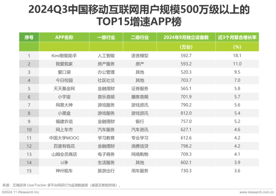 AIGC快速崛起:作为移动互联网的新兴行业,AIGC市场接受度显著提升,行业9月流量达8281.1万,赛道热门应用如Kimi智能助手、豆包近3个月复合增长率均超过15%,正加速渗透市场。