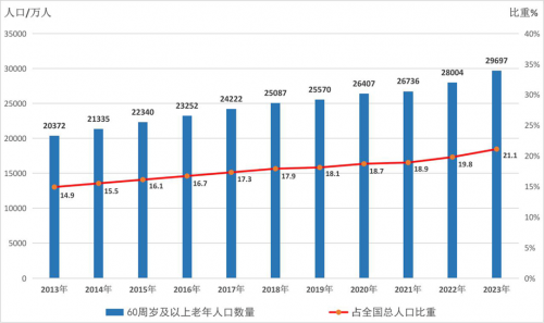 《中国社会科学报》曾援引权威数据表示,自2000年至2050年间,全球人口老龄化(60岁以上人口)比例将从10%攀升至21%,而中国的人口老龄化程度将从10%上升到33.3%。这一趋势促使社会各界对老龄群体给予高度关注。按照联合国关于老龄化的划分标准,60岁以上人口占总人口比重超过20%或65岁以上人口比重超过14%,表示进入中度老龄化社会。民政部公布《2023年度国家老龄事业发展公报》显示,截至2023年,60周岁以上老年人口数量占比21.1%,超过全国总人口的五分之一,表明我国已进入中度老龄化社会。