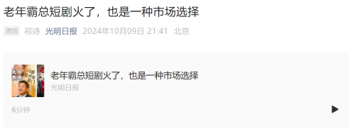 据此,光明日报指出,“在短视频已经深度融入公众日常的时代,面对如此庞大的一个群体,理当有符合其需求的短视频影像产品。带有一定演绎情节、便于理解的短剧的出现,恰好填补了这部分市场需求。从这个角度看,中老年短剧的出现是市场的选择,也是文化娱乐市场的一次自然‘演变’。”