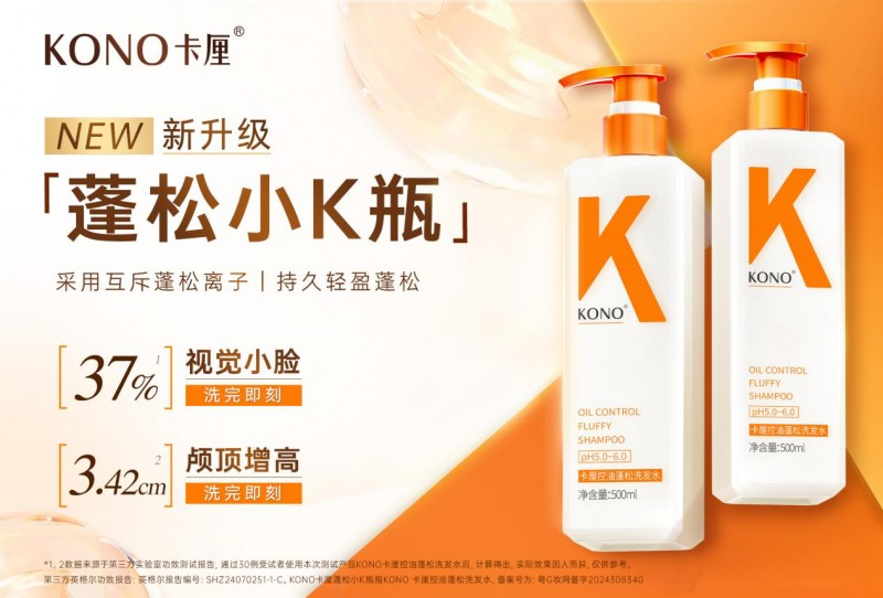 由第三方权威机构出具的人体功效检测报告显示,使用新升级KONO卡厘控油蓬松洗发水,洗完即刻颅顶增高3.42cm,视觉小脸37%;连续使用KONO卡厘控油蓬松洗发水6天后,消费者自评头发易梳理程度改善率为128.04%。
