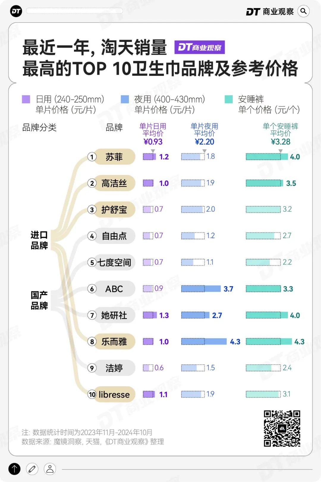 《DT商业观察》统计了近一年来(2023年11月至2024年10月),淘宝天猫平台上的热销卫生巾品牌及平均价格。