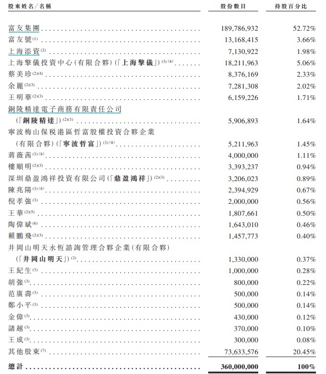 富友集团的其他持股5%以上的股东中,独立第三方兼股东朱灵君持股7.97%,蔡美珍持股7.11%,上海添资持股5.4%,独立第三方兼股东余盛持股5.2%,其他55名独立第三方兼股东持股约63%。
