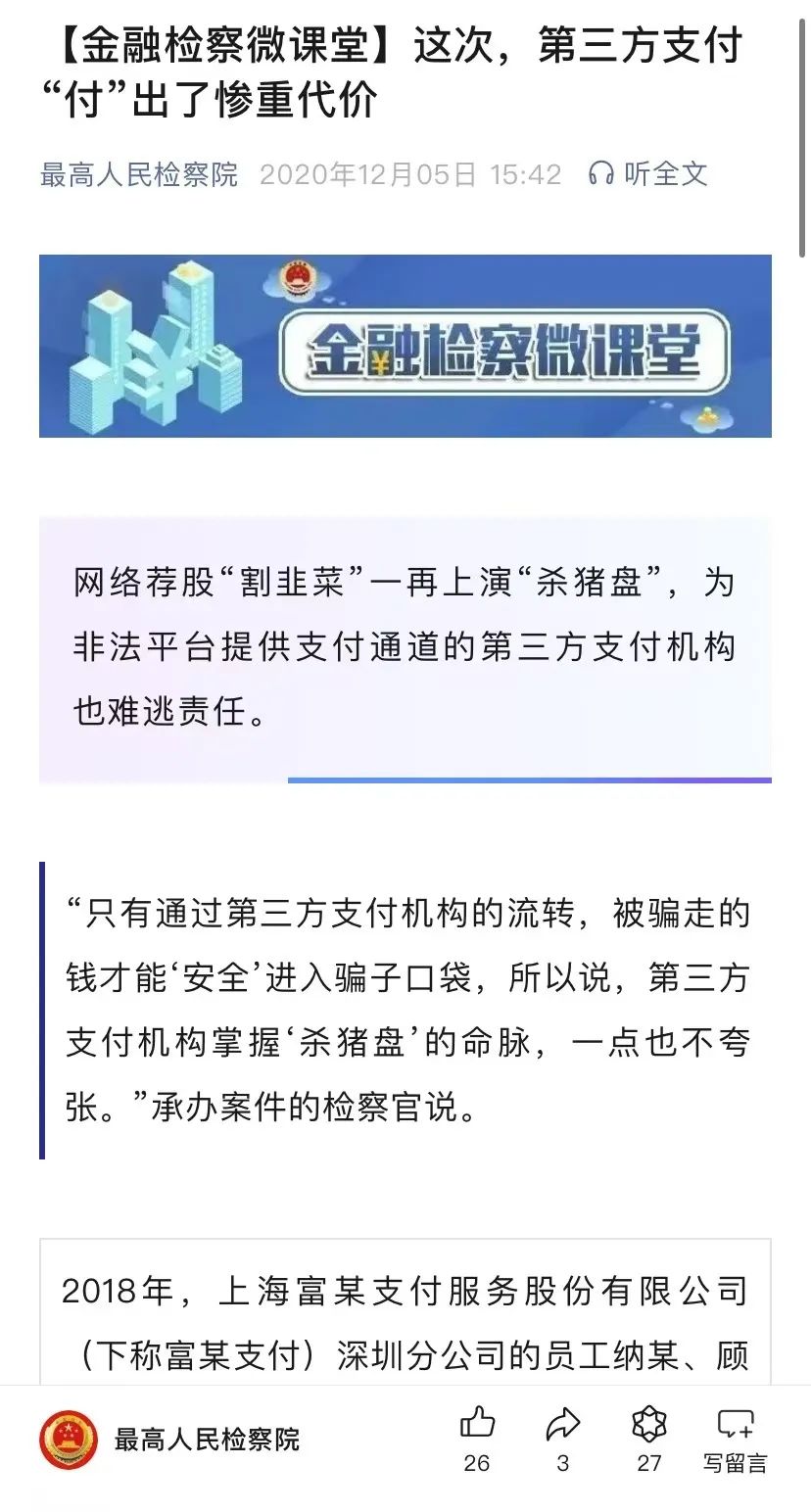2020年12月5日,最高人民检察院在其官方微信公众号点名富友支付,显示其为非法平台提供支付通道,一时间也让富友支付在业内声誉受到质疑。