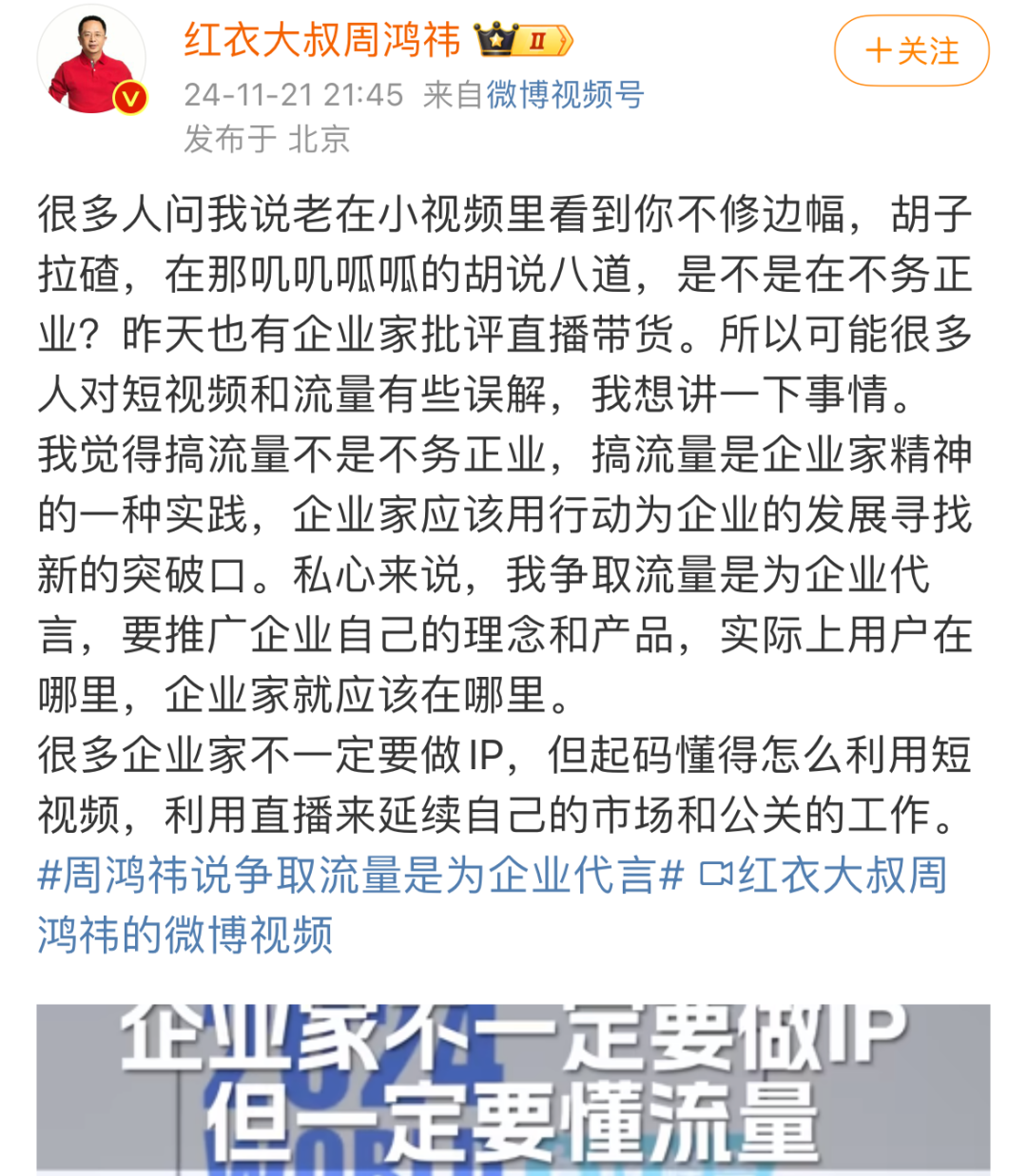 在11月22日的视频中,周鸿祎进一步针对企业家直播带货的问题做了回应。
