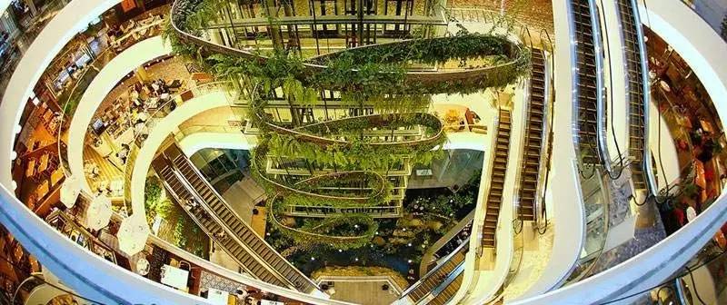 结合购物中心所在地的气候、地形进行合理设计。例如将人工瀑布与绿色植物相结合,体现当地独特的气候特点,以此突出购物中心的特色,在来往人群甚至世界各地游客心中形成标志性符号。例如泰国Emquartier的人工瀑布。