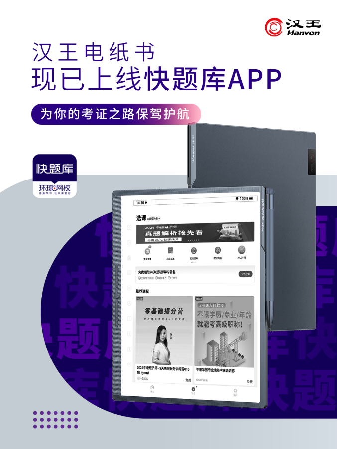 目前,汉王电纸书应用市场已上线环球网校旗下的快题库APP,快题库APP拥有建工、财经、教师公考类、职称类、职业资格类、学历类、医卫类、计算机八大类近百个考试项目的模拟试题,助你实战演练,用户可以通过汉王电纸书自主下载使用。