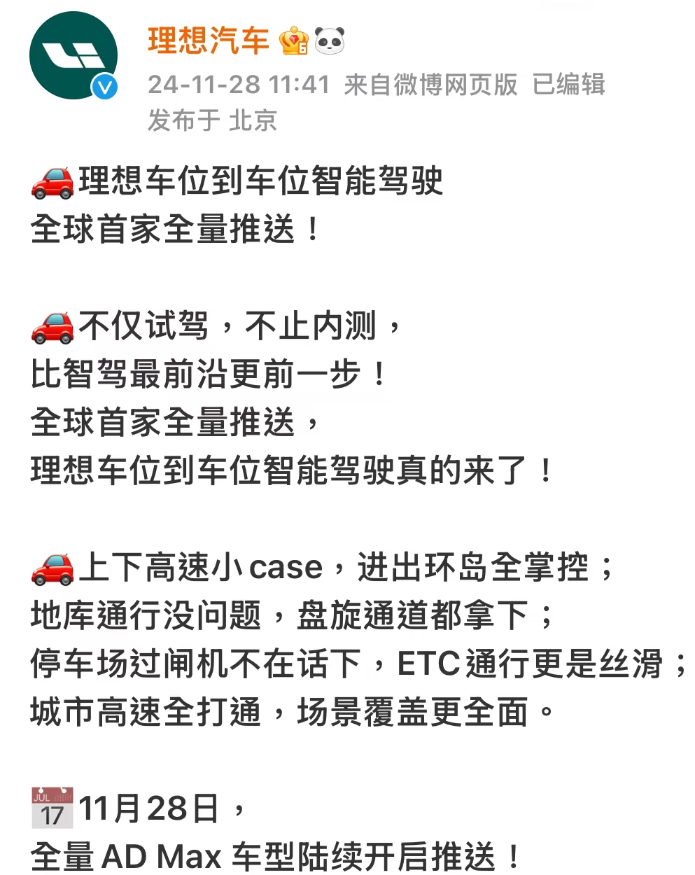 理想汽车11月28日在微博宣布,“车位到车位”智能驾驶全量推送。11月28日,全量AD Max车型陆续开启推送。