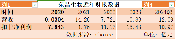 财报显示,2020年——2024Q3,除了2021年盈利外,其余时间荣昌生物的业绩全都亏损。截至2024年三季度末,在不到5年的时间内,公司扣非净利润累计亏损43.65亿元。