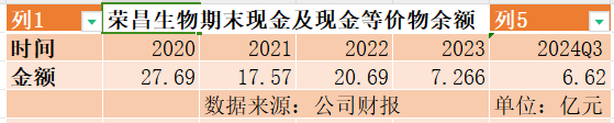 2024年3季显示,期末荣昌生物现金及现金等价物余额6.62亿元。