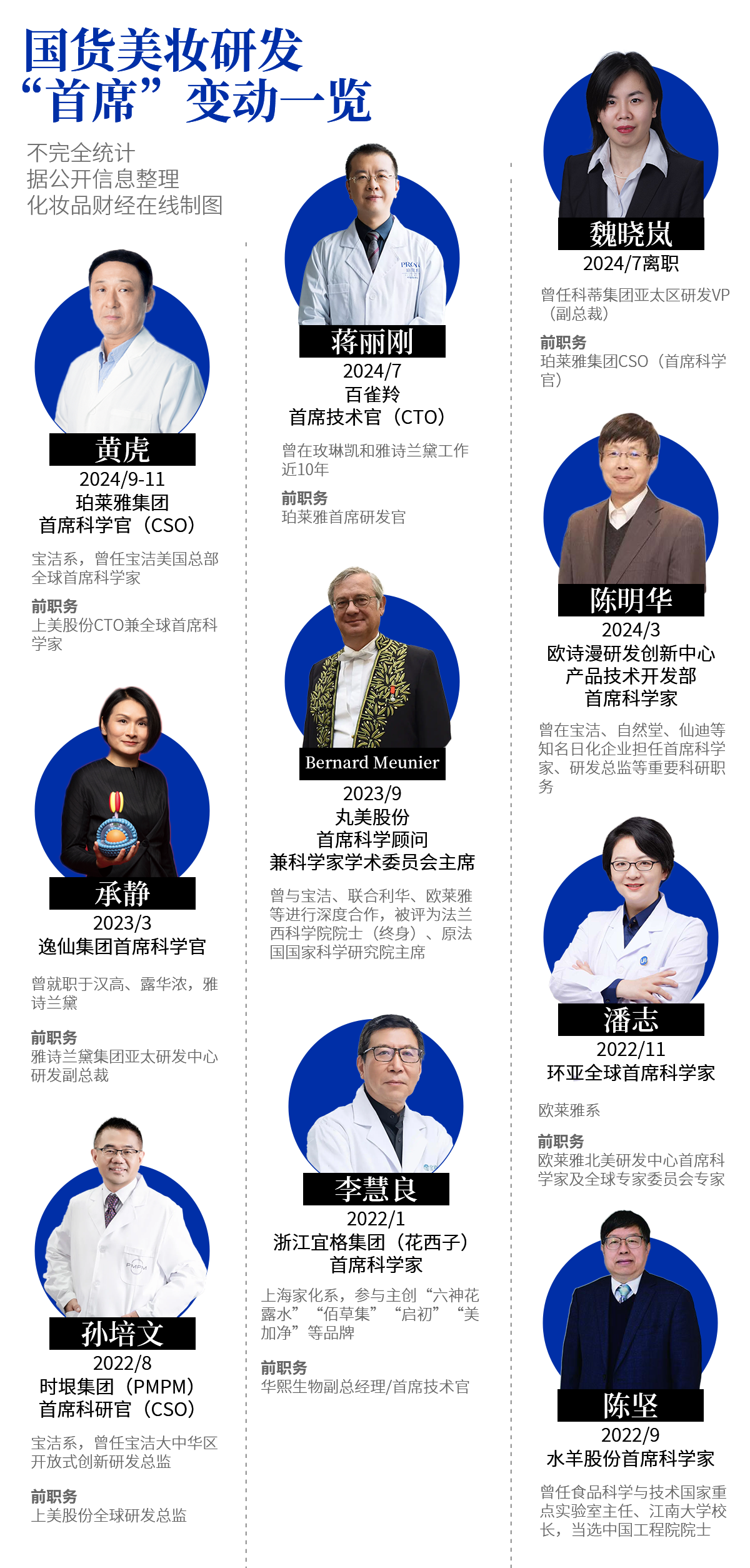 从各家企业首席研发官的职业背景不难发现,宝洁系、欧莱雅系等外资“大厂”的出身经历不约而同成了美妆企业挑选科研人才的共同指针。