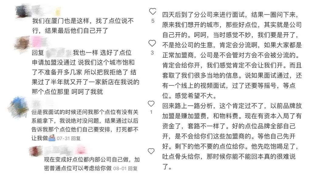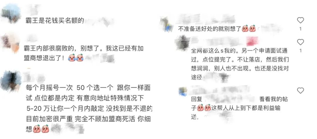同时有加盟商称,原本自己上报的商铺点位没有通过,没多久却看到该点位已经开店,由品牌直营或是老加盟商经营。甚至有人称,因争抢名额和点位,霸王茶姬内部还滋生了腐败现象。
