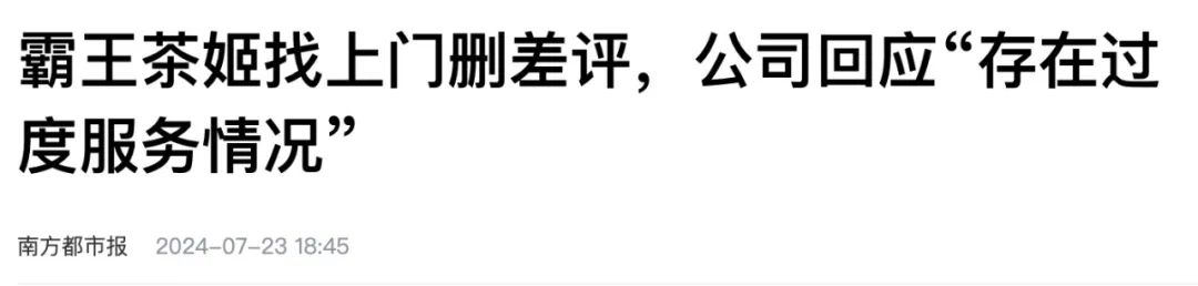 今年7月,“霸王茶姬家访事件”上了热搜,一顾客因在霸王茶姬某门店消费后给了差评被店员登门求删差评。涉事门店店长的回应是“顾客下单后,骑手、门店和平台多次尝试联系顾客未果,店员才决定上门拜访”,霸王茶姬官方的回应则是“本次事件门店存在过度服务的情况”。