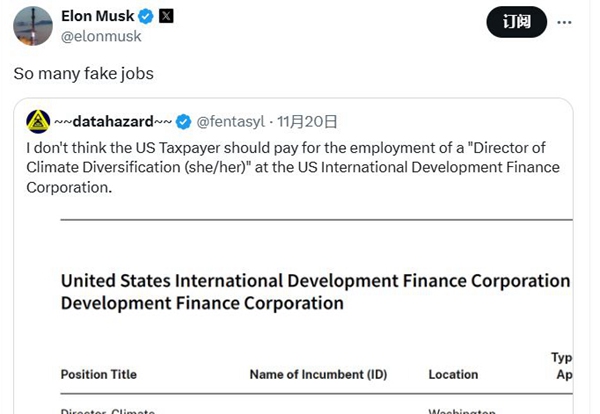 马斯克转发该贴后称美国有太多“假工作”,暗示将裁撤该职位。他的转发获得了3000多万浏览、20万个赞。被挂出名字的国际开发金融公司员工遭到了网暴并关闭了所有社交媒体账号。
