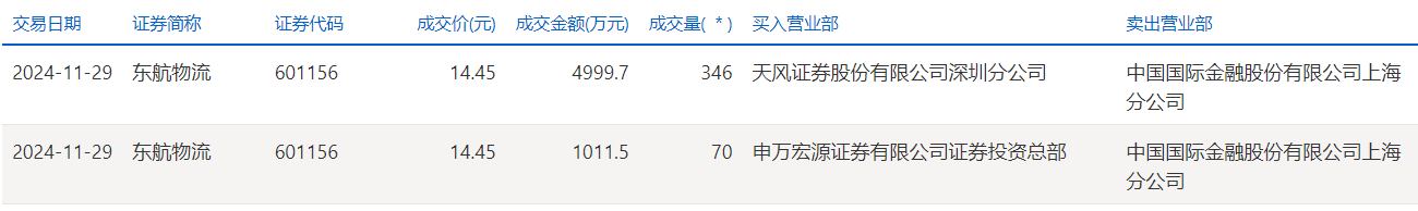 东航物流今日大宗交易折价成交416万股,成交额6011.2万元