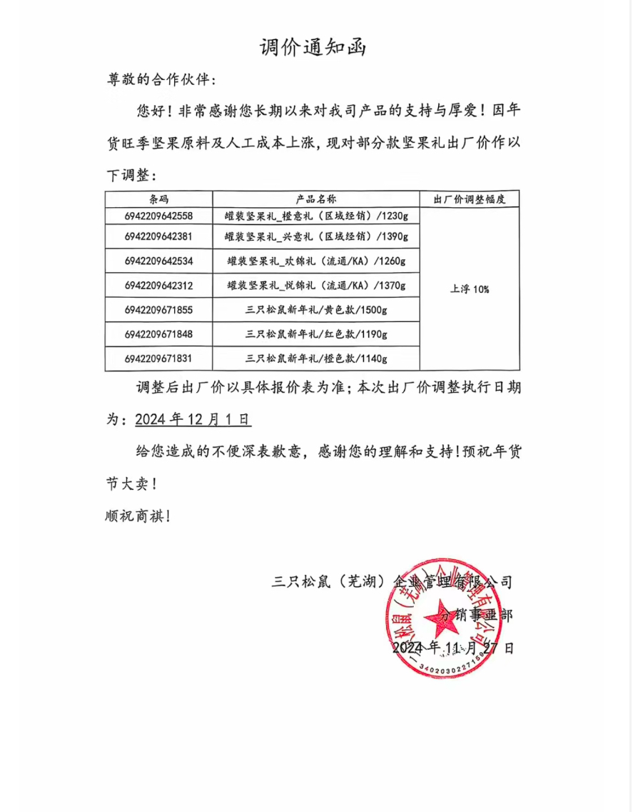 今天,小食代从渠道中看到该公司近日发出了一份“调价通知函”,当中指出,12月1日起三只松鼠对多款坚果礼的出厂价执行调整,涉及罐装坚果礼、新年礼产品等7款产品,上浮幅度均为10%。