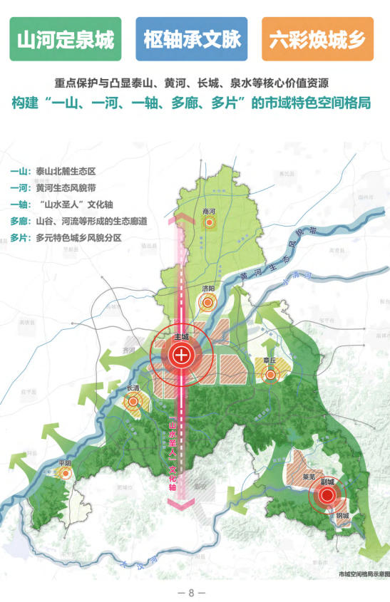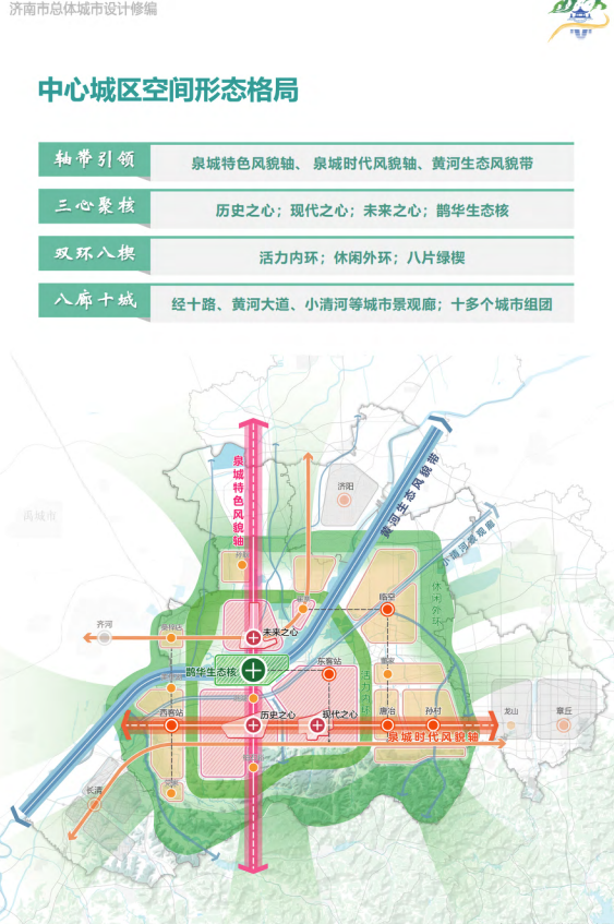 在新的发展格局下,济南中心城区正逐步转向以黄河为轴带、鹊华为绿核的组团式发展格局,有序拓展城市空间,未来将形成“轴带引领、三心聚核、双环八楔、八廊十城””的空间形态格局,其中三心聚核指的是历史之心、现代之心、未来之心和鹊华生态核,双环八楔指活力内环、休闲外环和八片绿楔,八廊十城指经十路、黄河大道、小清河等城市景观廊以及十多个城市组团。