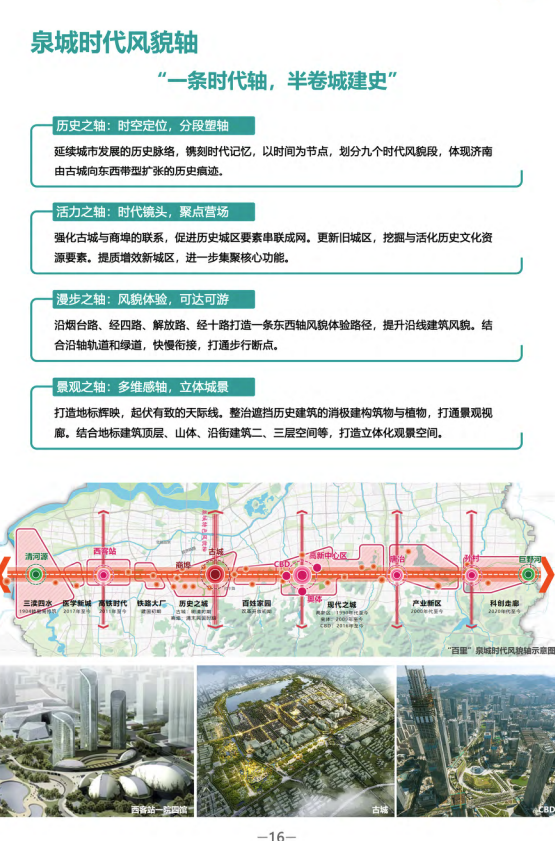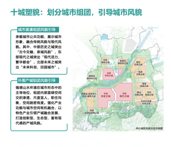 塑景观城,在中心城区尺度上,济南市将集合轴线、绿环、道路等有机接线,划分中部历史之城、东部现代之城、北部未来之城、桑梓店新材料之城、董家陆港之城等城市组团,引导城市风貌,塑造56条历史文化街巷、30条活力商业街巷、14条景观休闲街巷,通过明确主题、提升业态、强化文化内核等方式彰显街巷风貌,展示济南的“泉城范、烟花气”。