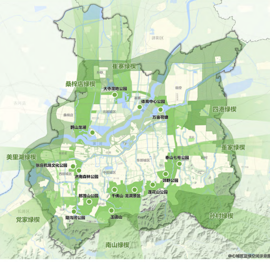 绿化方面,济南市中心城区传承了历史上“城即园林”的特点,山水汝城。城绿交融。济南市将通过构建“环、楔、廊、园”交织的绿色空间体系,将城市各级绿地系统与城市外围自然生态系统有机连接,实现城市空间与绿色生态空间的高效融合与互动。