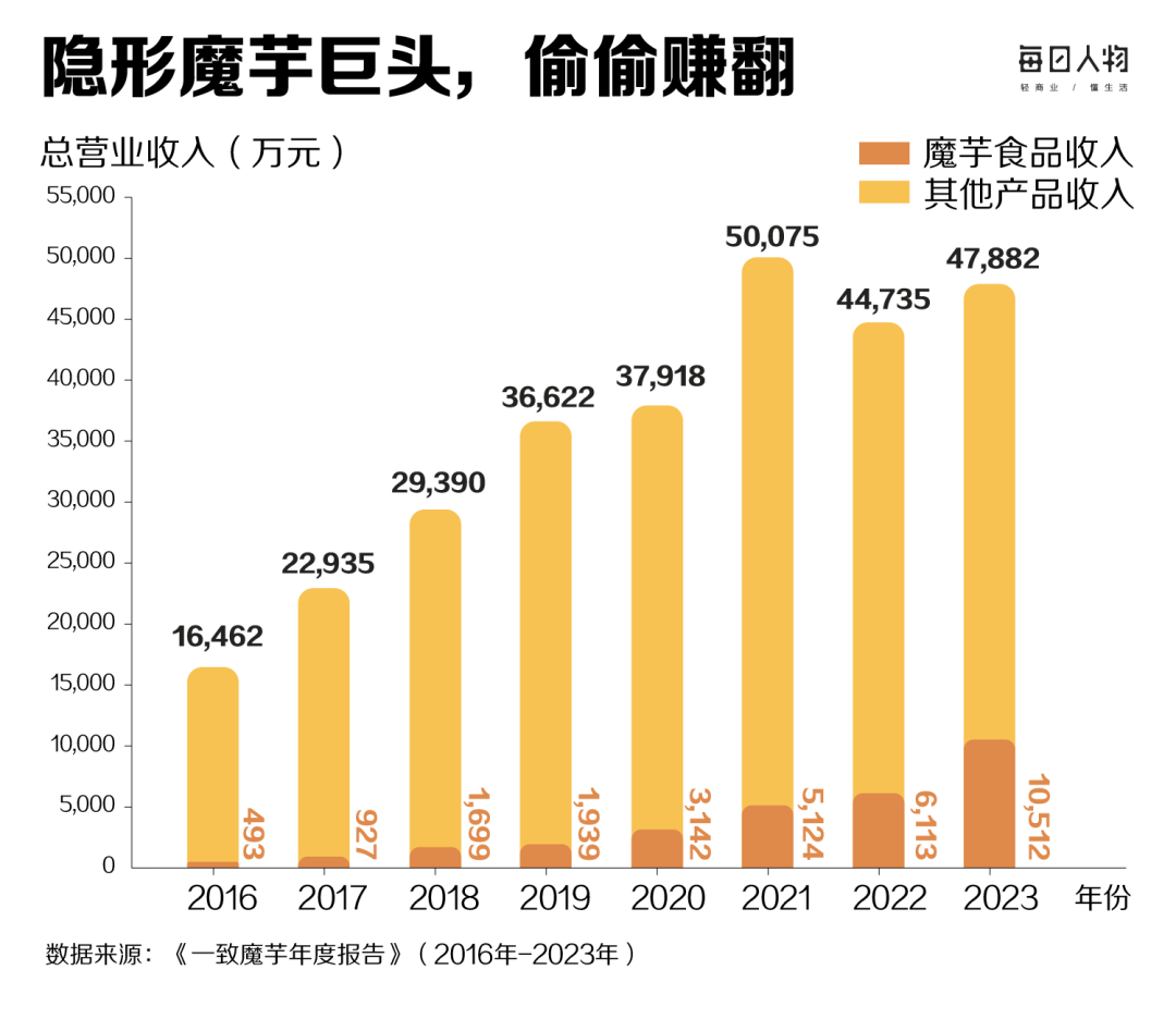 早在2016年,一致魔芋就靠卖魔芋的初级产品,魔芋胶、魔芋精粉等,达到了1.6亿元的营收。后来,随着卫龙、盐津铺子等品牌带火了魔芋爽,作为原料厂商的一致魔芋营收也持续走高,去年更是接近5亿元。但是相比家喻户晓的卫龙,一致魔芋显得低调许多。