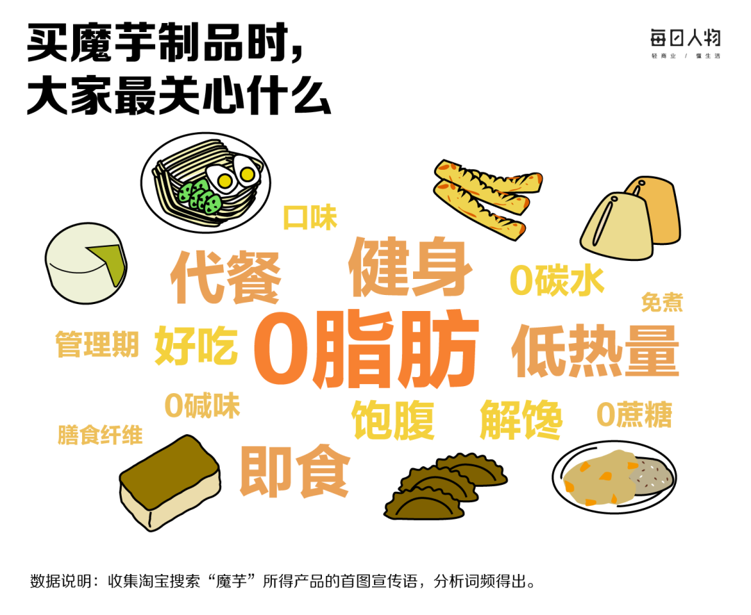 看到了年轻人们对健康低卡食物的追求,商家们在宣传时也是铆足了劲儿,把“0脂肪”“低热量”“0碳水”这样的词,加粗放大标注在每一个魔芋食品的介绍页面上。