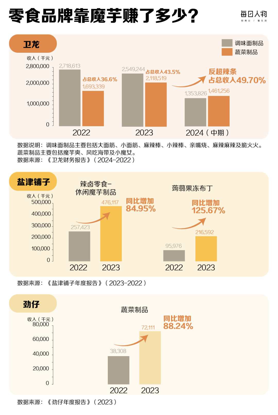 靠魔芋狠赚一笔的不止卫龙。虽然入局稍晚,但盐津铺子、劲仔、百草味、良品铺子等品牌都纷纷加入魔芋赛道。盐津铺子咸甜两手抓——咸的魔芋素毛肚,做成了麻酱味、麻辣火锅味;甜的盯上蒟蒻果冻,在“0糖0卡0脂0色素”的健康标签下,从2022年到2023年,蒟蒻果冻的营收同比增加了125.67%。