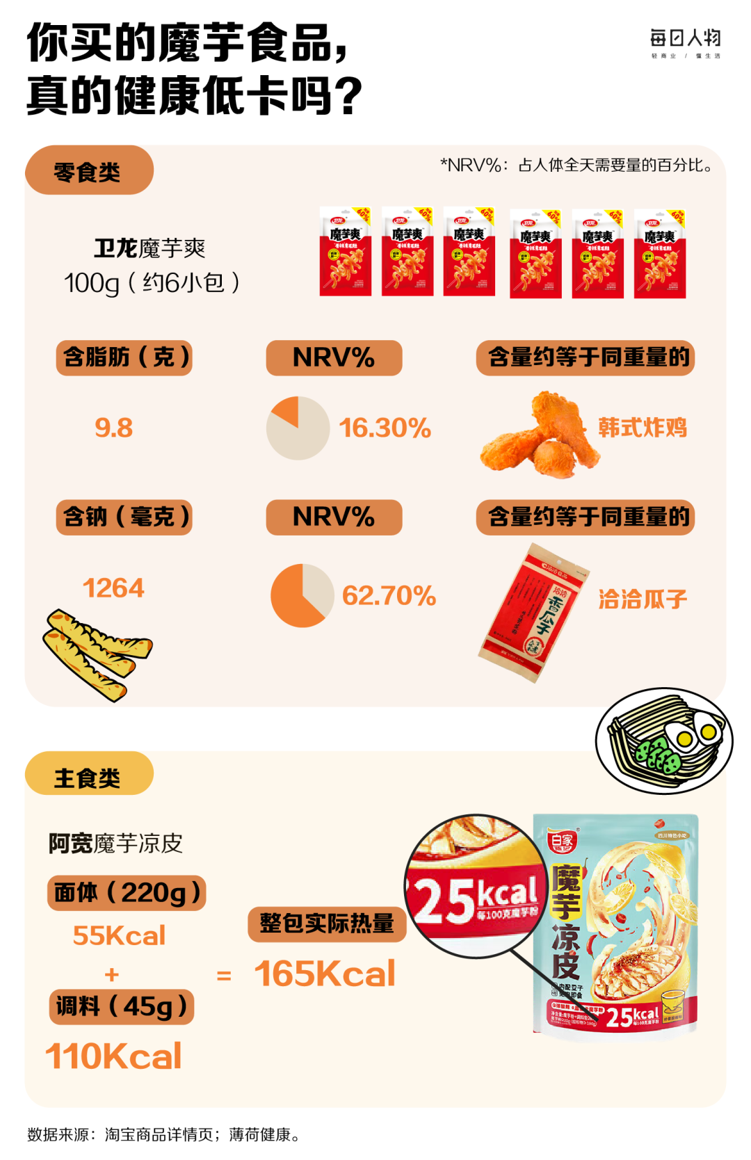 只写面体热量,不写调料热量,这样的文字游戏,时常发生在卖魔芋方便速食的商家中。只有心心念念减肥的年轻人,在深夜心安理得地嗦下一整包鲜香麻辣的魔芋凉皮后,不小心瞥见包装背后的详细配料时,才能恍然大悟这场“热量诈骗”。