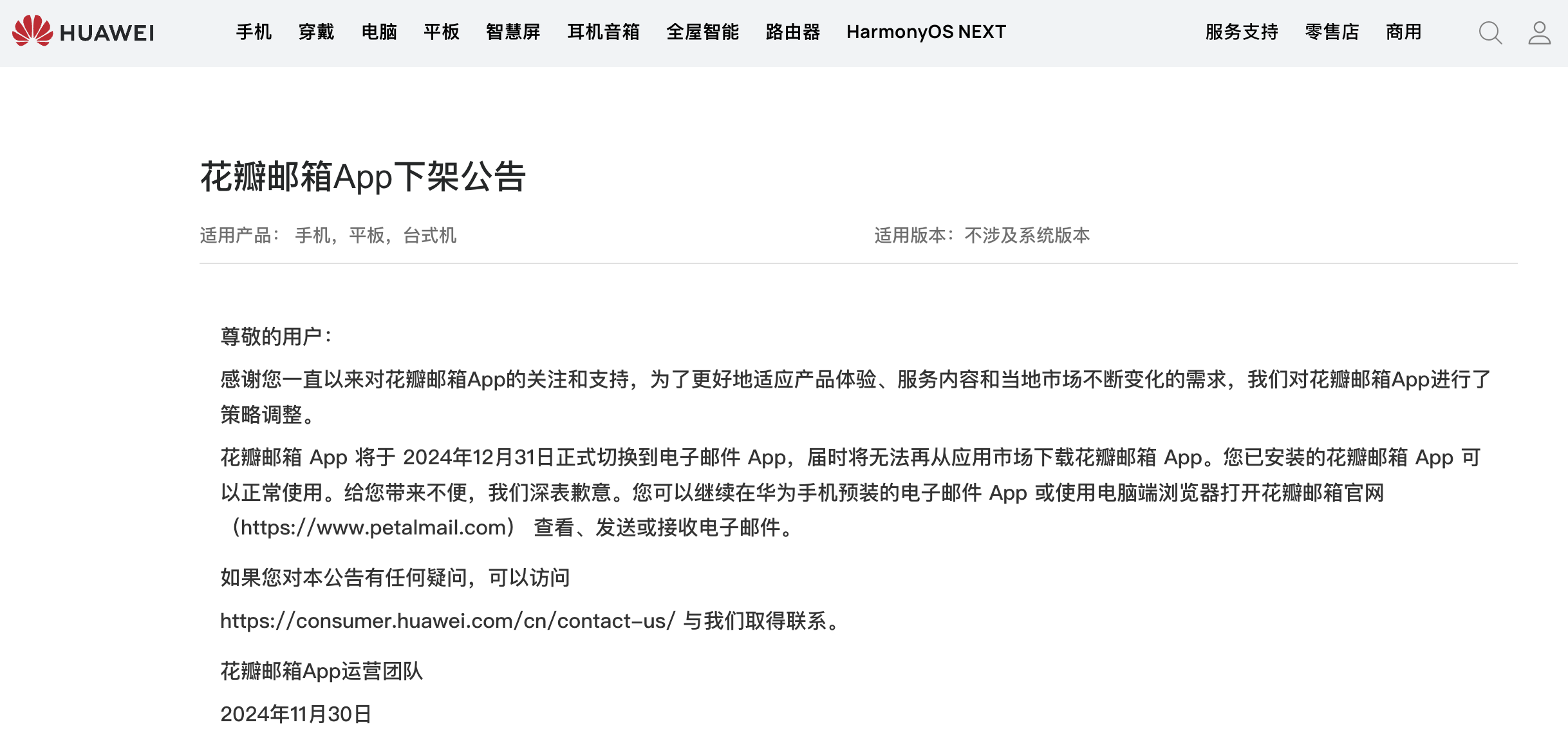 11月30日,花瓣邮箱App发布下架公告称,将于2024年12月31日正式切换到电子邮件App,届时将无法再从应用市场下载花瓣邮箱App。已安装的花瓣邮箱App可以正常使用。用户可以继续在华为手机预装的电子邮件App或使用电脑端浏览器打开花瓣邮箱官网(https://www.petalmail.com)查看、发送或接收电子邮件。